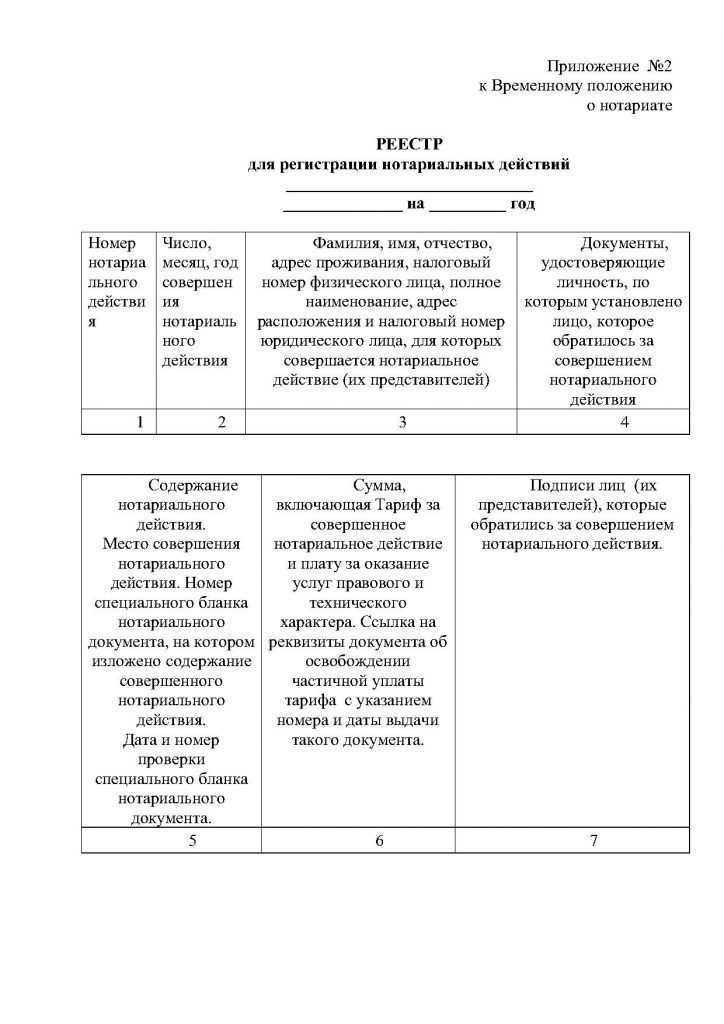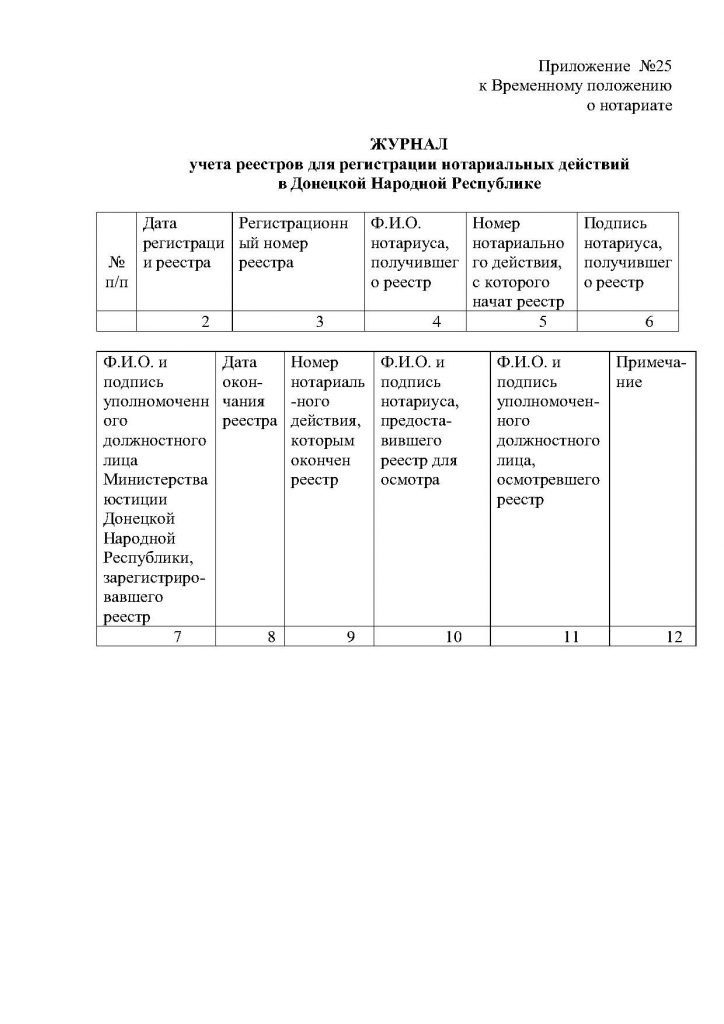 28.1. Обо всех нотариальных действиях, совершенных нотариусами, делается запись в Реестрах для регистрации нотариальных действий. Каждый нотариус ведет один реестр для регистрации нотариальных действий (далее — Реестр), нумерация в котором начинается в первый рабочий день нового года и заканчивается в последний рабочий день этого года (Приложение 2). Реестр регистрируется органом, осуществляющим функции по контролю в сфере нотариата, Министерства юстиции Донецкой Народной Республики в Журнале учета реестров для регистрации нотариальных действий (Приложение 25). Ведение нотариусом одновременно более одного Реестра запрещается. Реестры, не законченные в предыдущем году, не могут использоваться нотариусом в следующем году. По окончании Реестра нотариус регистрирует в органе, осуществляющем функции по контролю в сфере нотариата, Министерства юстиции Донецкой Народной Республики новый Реестр.