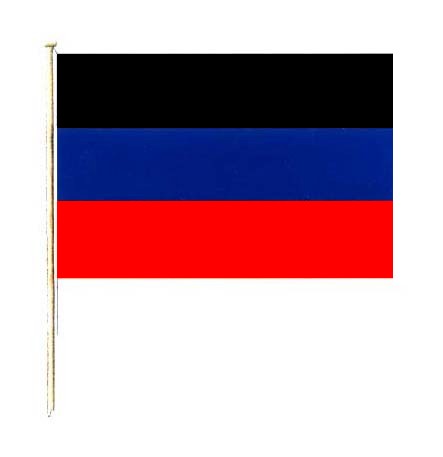 - Государственный флаг Донецкой Народной Республики представляет собой прямоугольное полотнище из трех равновеликих горизонтальных полос: верхней – черного, средней – синего и нижней – красного цвета. Отношение ширины флага к его длине 2:3.