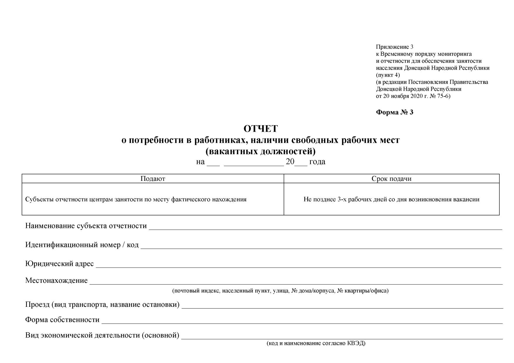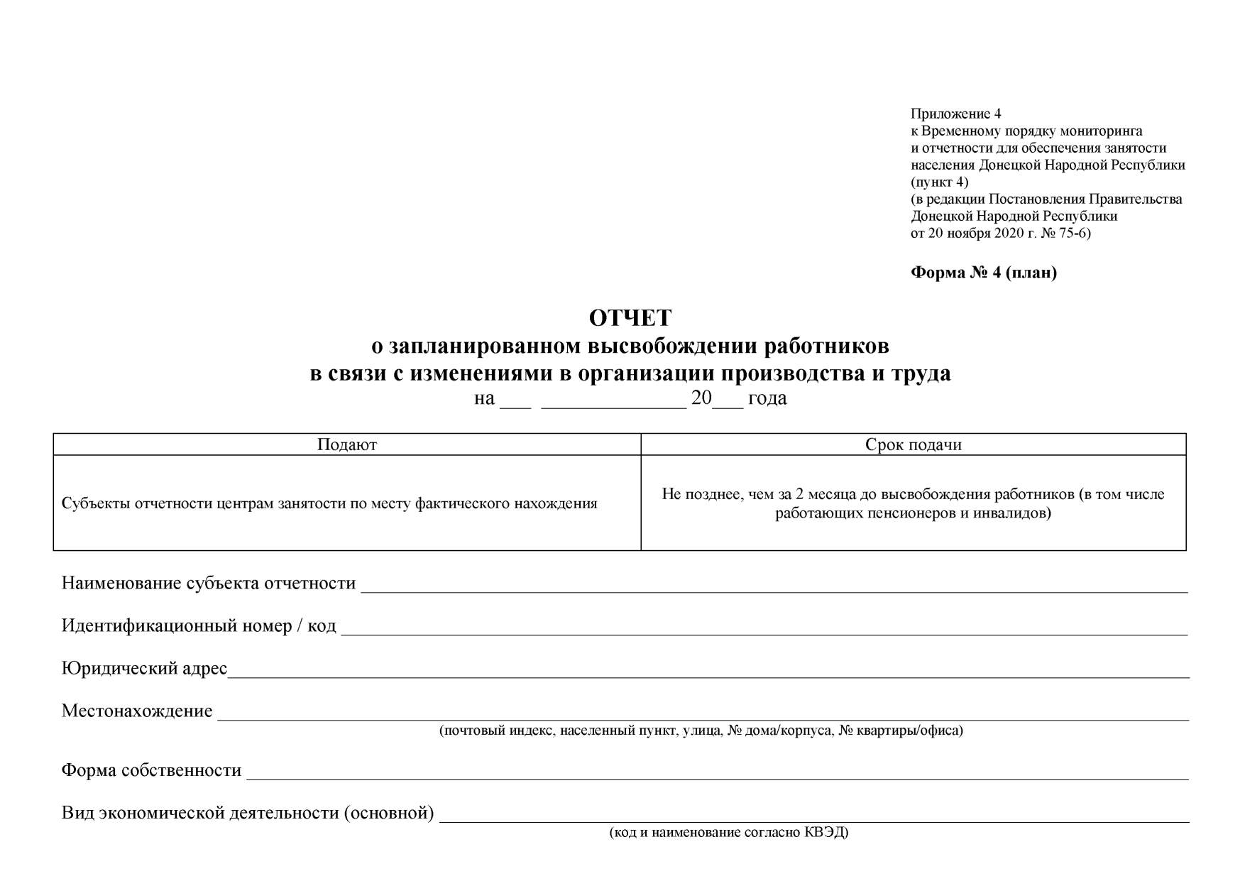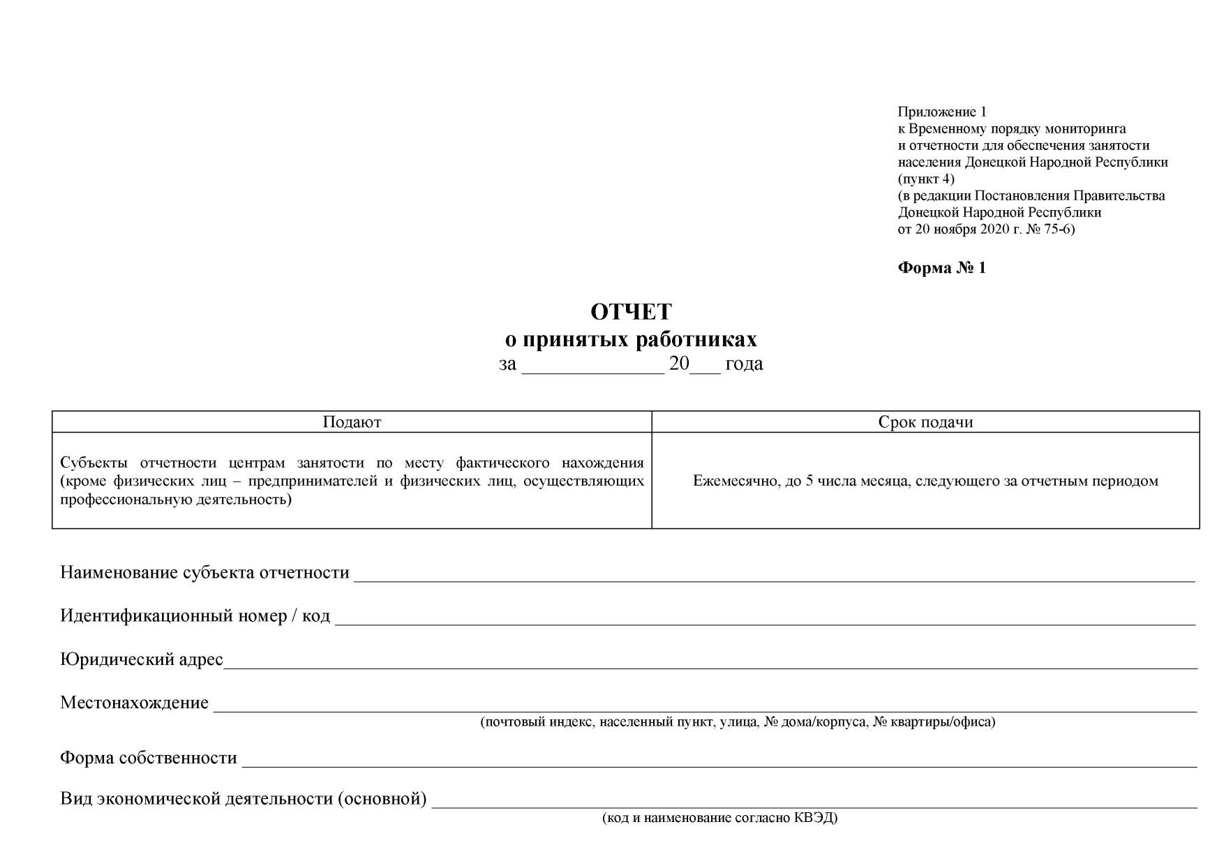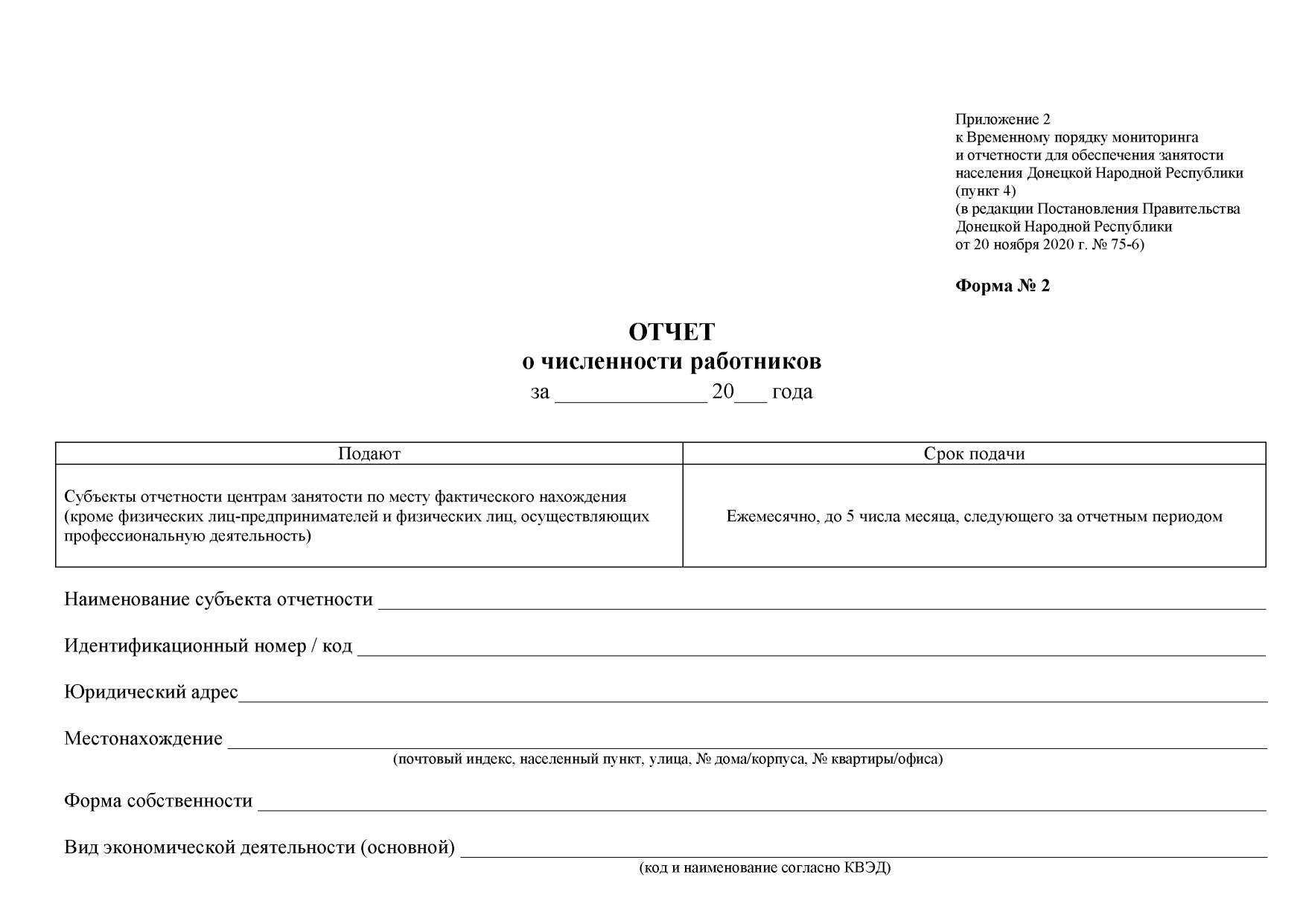 В целях обеспечения эффективного учета и анализа показателей функционирования регистрируемого рынка труда, использования трудовых ресурсов Донецкой Народной Республики, с учетом практического применения Временного порядка мониторинга и отчетности для обеспечения занятости населения Донецкой Народной Республики, утвержденного Постановлением Совета Министров Донецкой Народной Республики от 12 марта 2015 года № 3-6, руководствуясь статьями 77, 78 Конституции Донецкой Народной Республики, статьей 38 Закона Донецкой Народной Республики от 29 мая 2015 года № 50-IHC «О занятости населения», статьями 16, 23 Закона Донецкой Народной Республики от 30 ноября 2018 года № 02-IIНС «О Правительстве Донецкой Народной Республики», Правительство Донецкой Народной Республики