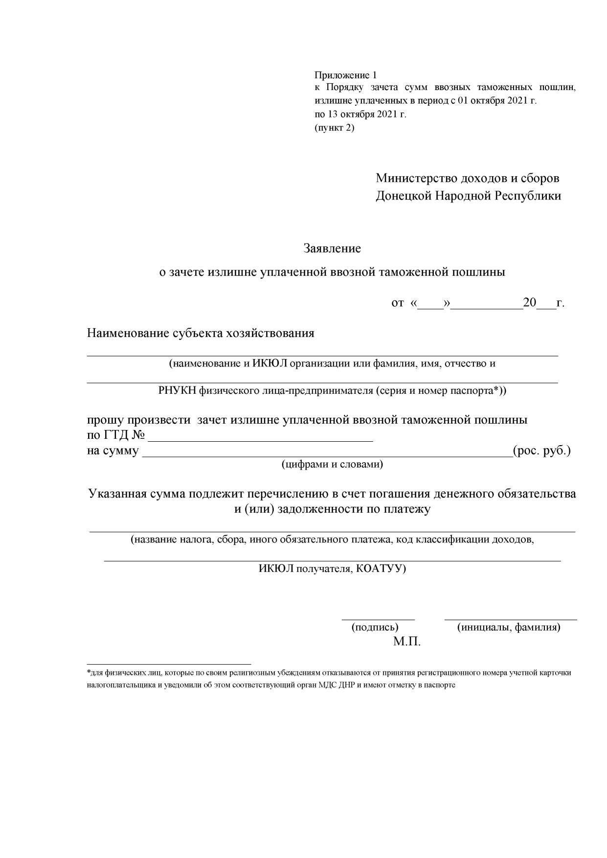 - Настоящий Порядок определяет последовательность организации и осуществления действий должностных лиц Министерства доходов и сборов Донецкой Народной Республики при зачете сумм ввозных таможенных пошлин, излишне уплаченных в период с 01 октября 2021 г. по 13 октября 2021 г.