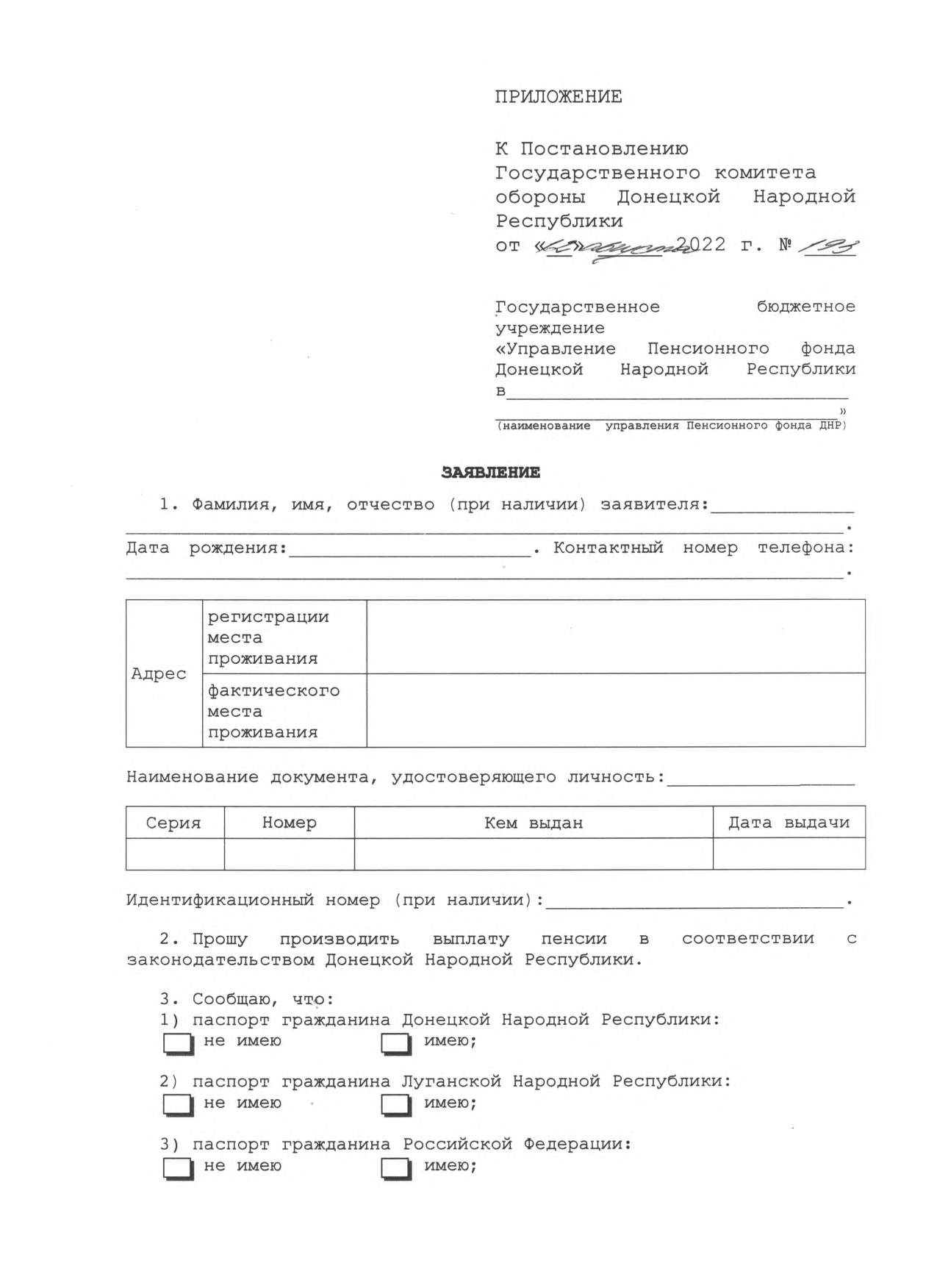 3.3.1. Паспорта гражданина Украины, либо паспорта или временного удостоверения личности гражданина Донецкой Народной Республики, либо адресной справки со сроком действия до 6 месяцев, либо удостоверения на постоянное проживание на территории Донецкой Народной Республики.