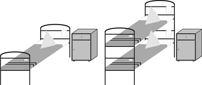 Кровати металлические или вагонного типа по численности осужденных (камеры штрафного изолятора, дисциплинарного изолятора, помещений камерного типа, единых помещений камерного типа, одиночных камер, в которых осужденные отбывают взыскания, оборудуются откидными металлическими кроватями, которые закрываются на замок).