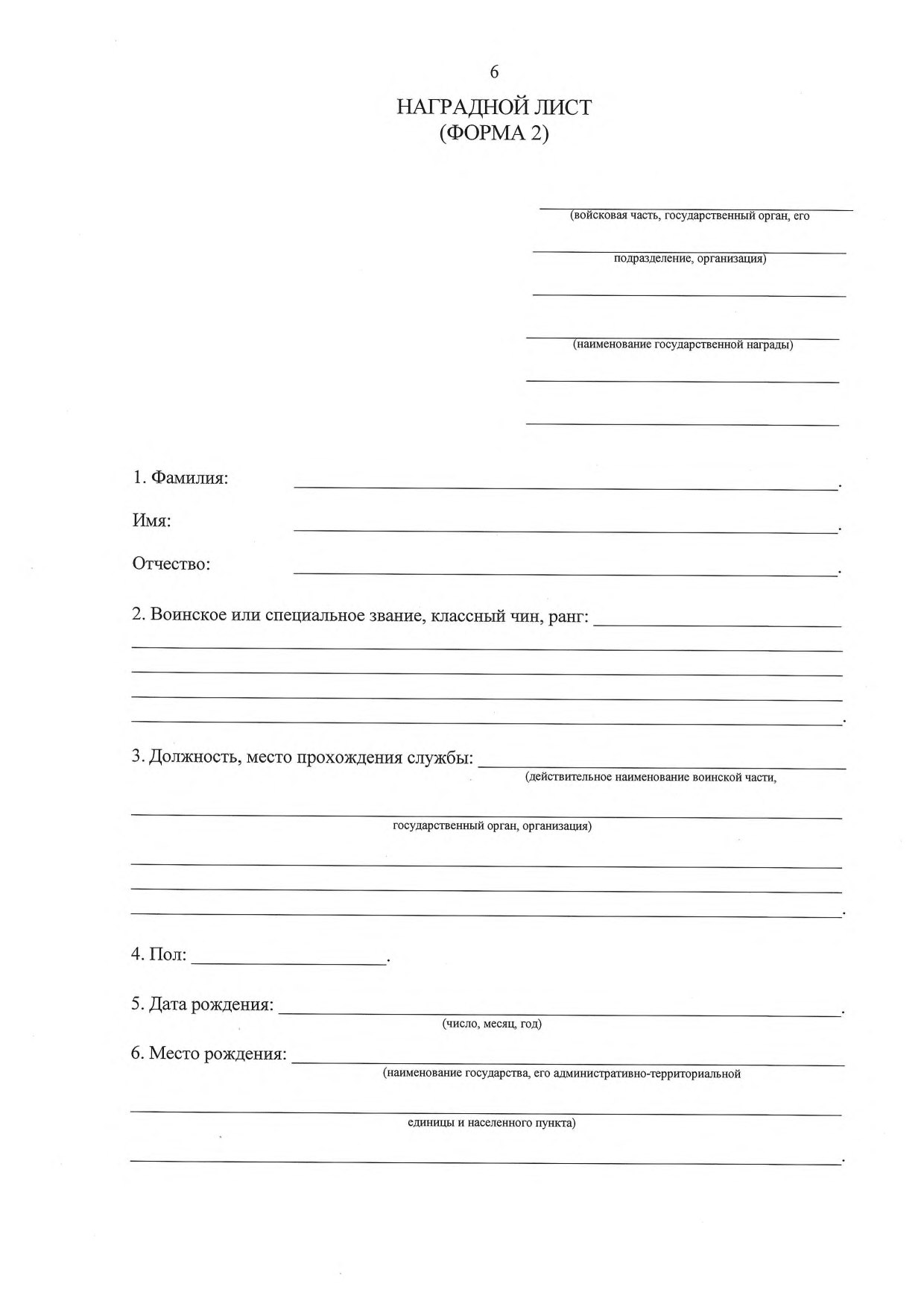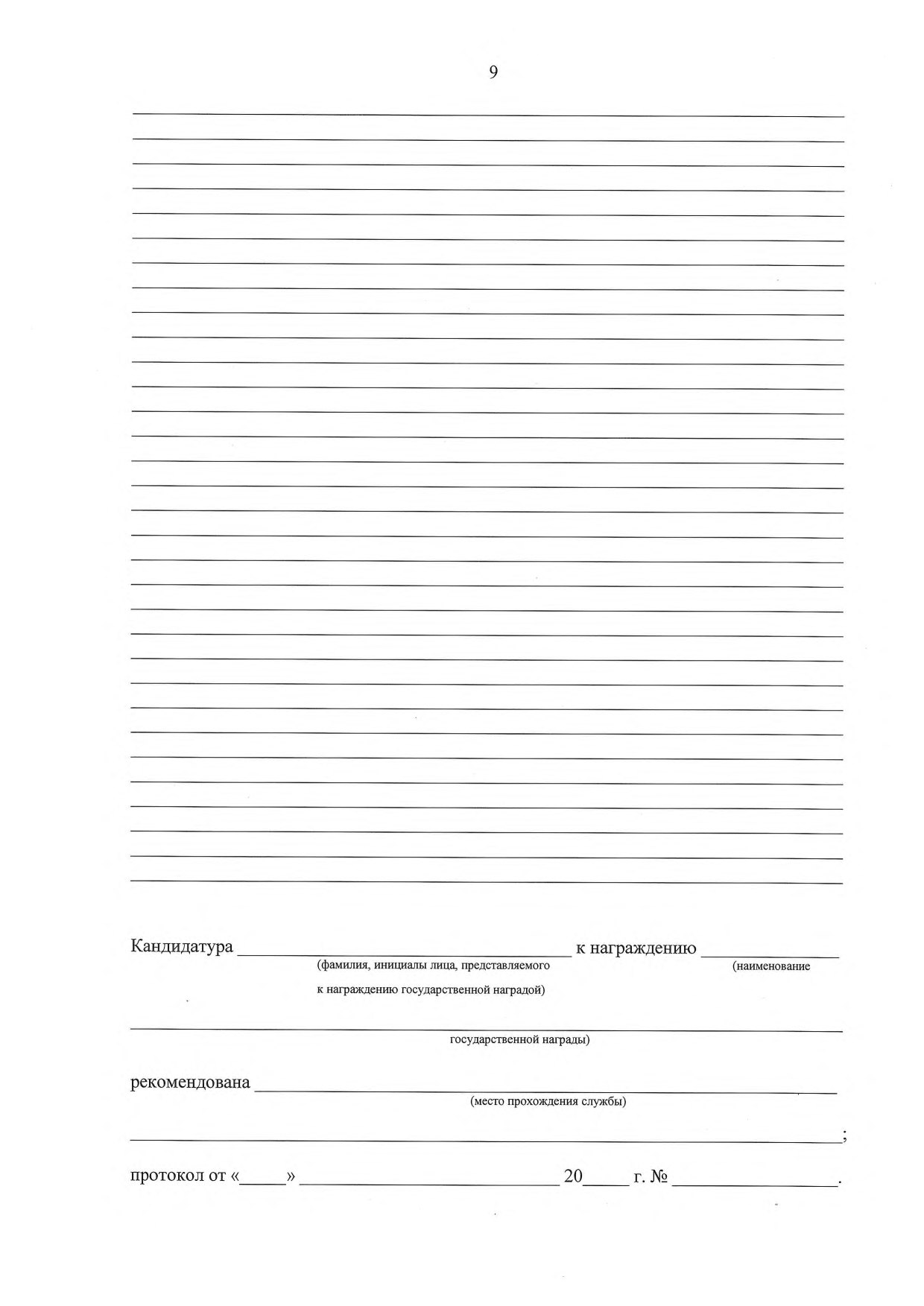 В центральной части бланка предусмотрено поле высотой 60 мм для размещения надписи, содержащей фамилию, имя, отчество, должность, место работы (службы) (при наличии) награждаемого лица, а также его заслуги (фабулу).