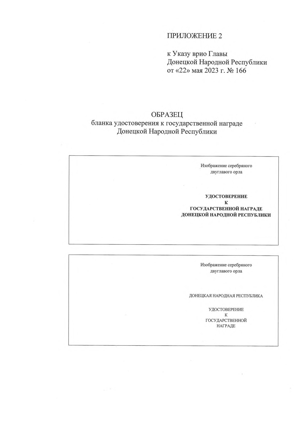 2.2. Образец бланка удостоверения к государственной награде Донецкой Народной Республики (приложение 2).