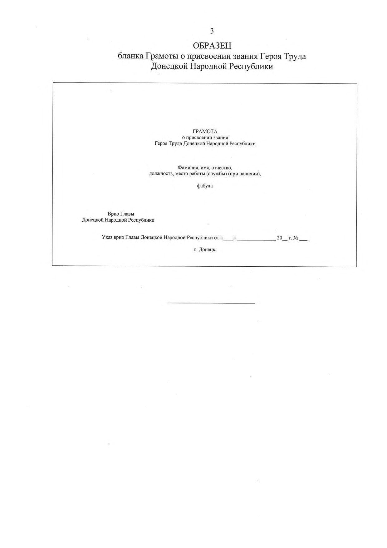 Ниже в левом краю бланка в одну строку располагаются: слева — надпись: «Указ врио Главы Донецкой Народной Республики», выполненная заглавными и строчными буквами черного цвета (размеры букв: заглавных — 3 мм, строчных — 2 мм), справа — графа черного цвета для внесения сведений о дате и номере указа врио Главы Донецкой Народной Республики о присвоении почетного звания Донецкой Народной Республики: «от « » 20 г. № ».