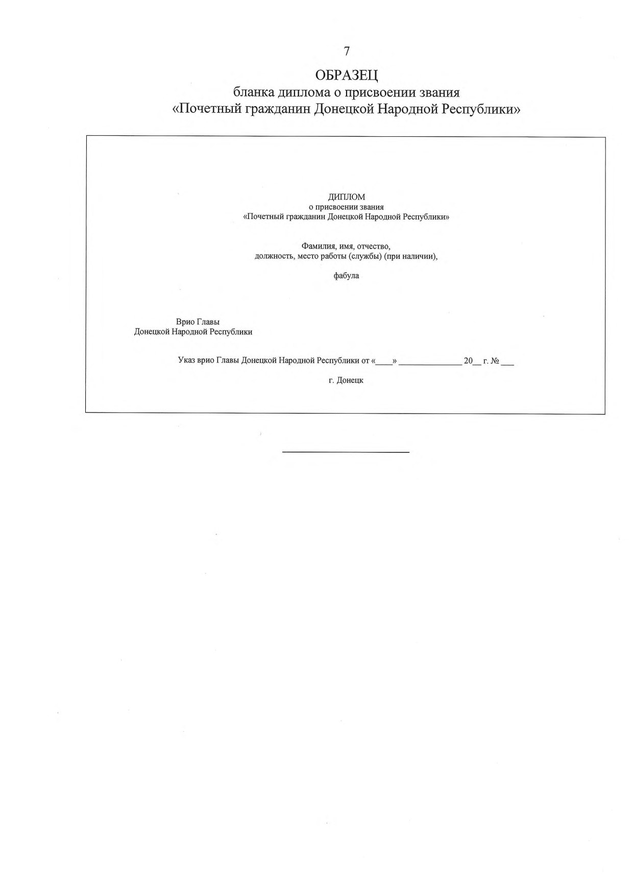 Ниже в левом краю бланка в одну строку располагаются: слева — надпись: «Указ врио Главы Донецкой Народной Республики», выполненная заглавными и строчными буквами черного цвета (размеры букв: заглавных — 3 мм, строчных — 2 мм), справа — графа черного цвета для внесения сведений о дате и номере указа врио Главы Донецкой Народной Республики о присвоении звания «Почетный гражданин Донецкой Народной Республики»: «от « »_______ 20_________ г. № ».