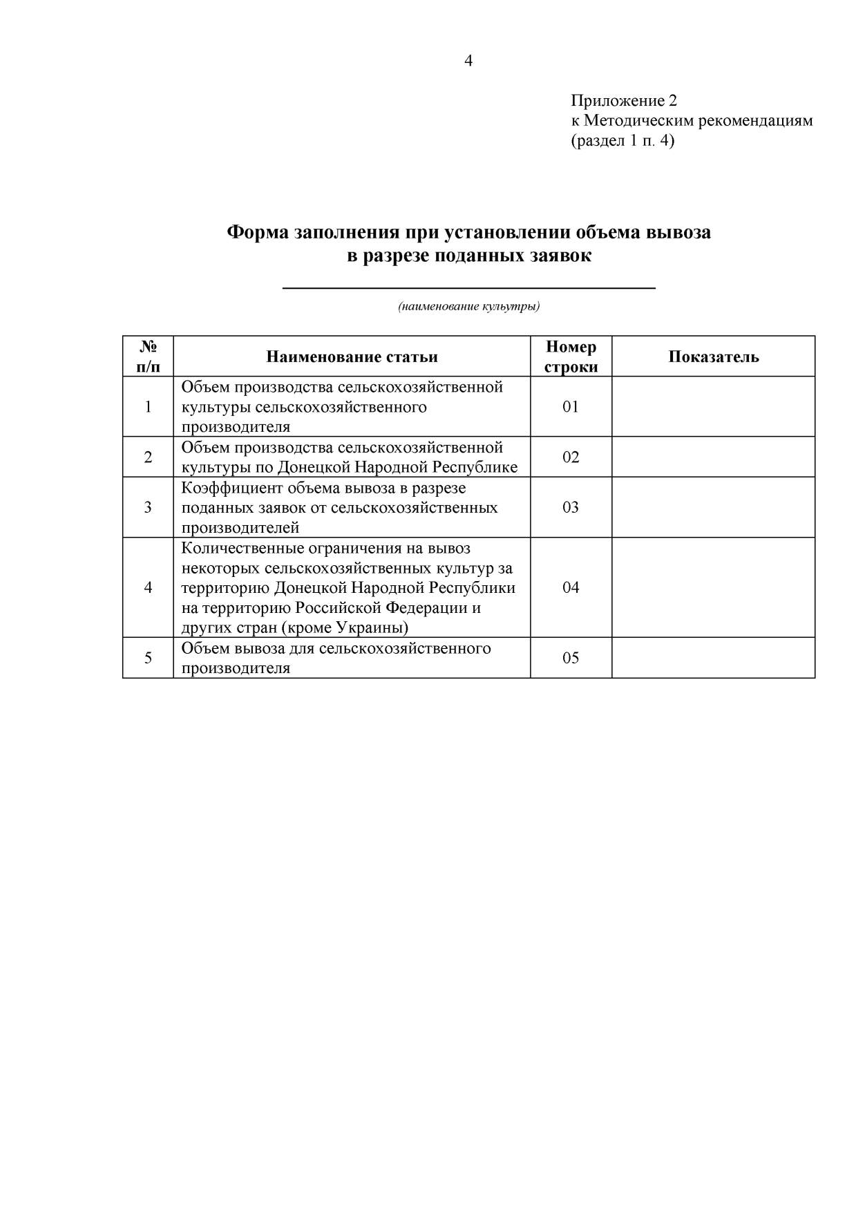- Строка 04 «Количественные ограничения на вывоз некоторых сельскохозяйственных культур за территорию Донецкой Народной Республики на территорию Российской Федерации и других стран (кроме Украины)»: