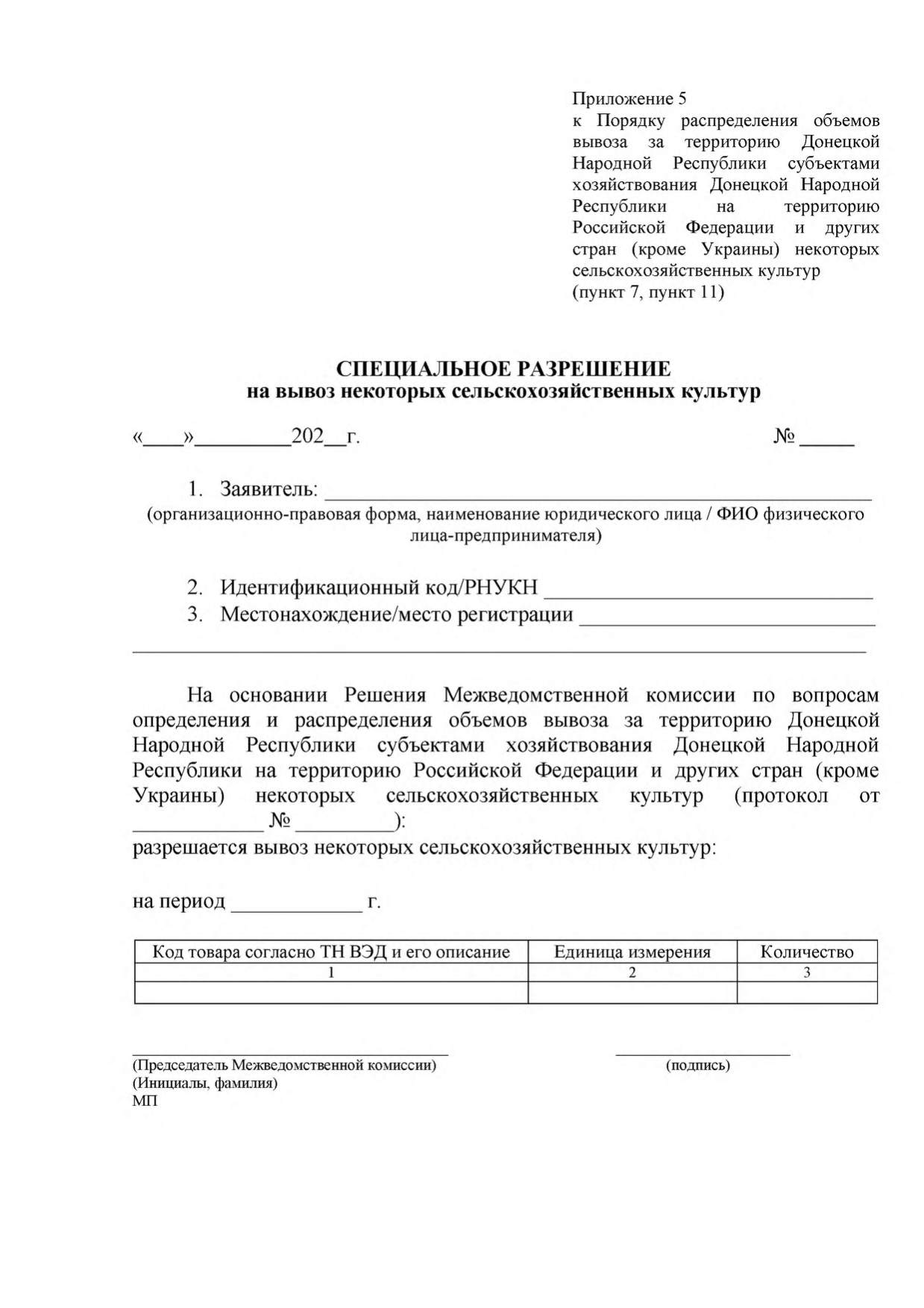 «7. В день заседания Межведомственной комиссии и подписания Протокола оформляется документ, удостоверяющий право на вывоз за территорию Донецкой Народной Республики на территорию Российской Федерации и других стран (кроме Украины) некоторых сельскохозяйственных культур - Специальное разрешение на вывоз некоторых сельскохозяйственных культур (далее - Специальное разрешение), согласно приложению 5 к настоящему Порядку, которое выдается заявителю. Специальное разрешение выдается на период до первого мая года, следующего за годом уборки урожая некоторых сельскохозяйственных культур, на которые устанавливаются количественные ограничения.»;
