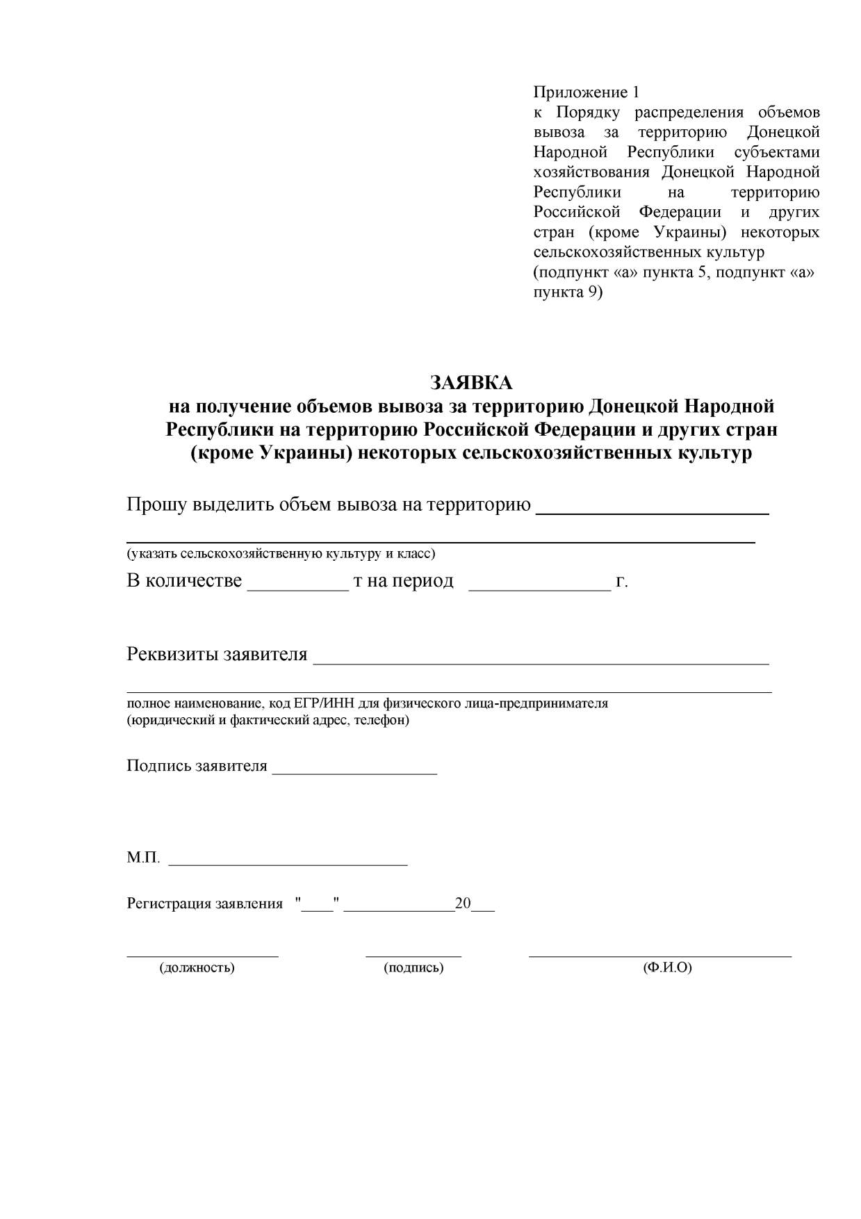 а) заявка на получение объемов вывоза за территорию Донецкой Народной Республики на территорию Российской Федерации и других стран (кроме Украины) некоторых сельскохозяйственных культур, согласно приложению 1. Объем вывоза за территорию Донецкой Народной Республики на территорию Российской Федерации и других стран (кроме Украины) некоторых сельскохозяйственных культур, указанный в заявке, не может превышать объем вывоза некоторых сельскохозяйственных культур установленный Межведомственной комиссией на данном этапе;
