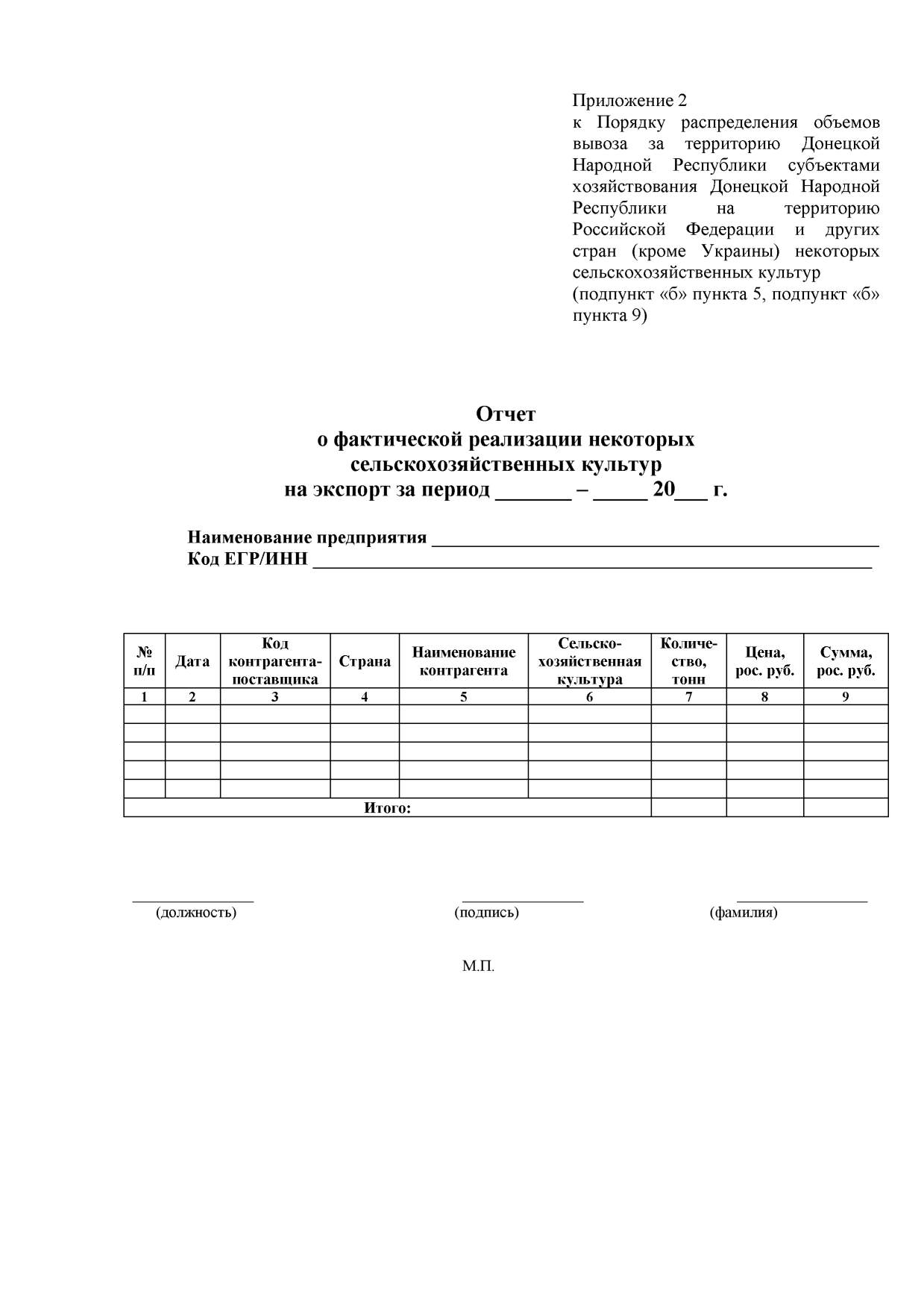 б) отчет о фактической реализации некоторых сельскохозяйственных культур на экспорт (приложение 2 к настоящему Порядку) за предыдущие двенадцать месяцев до даты подачи заявки (в случае наличия ранее совершенных таких вывозных операций);