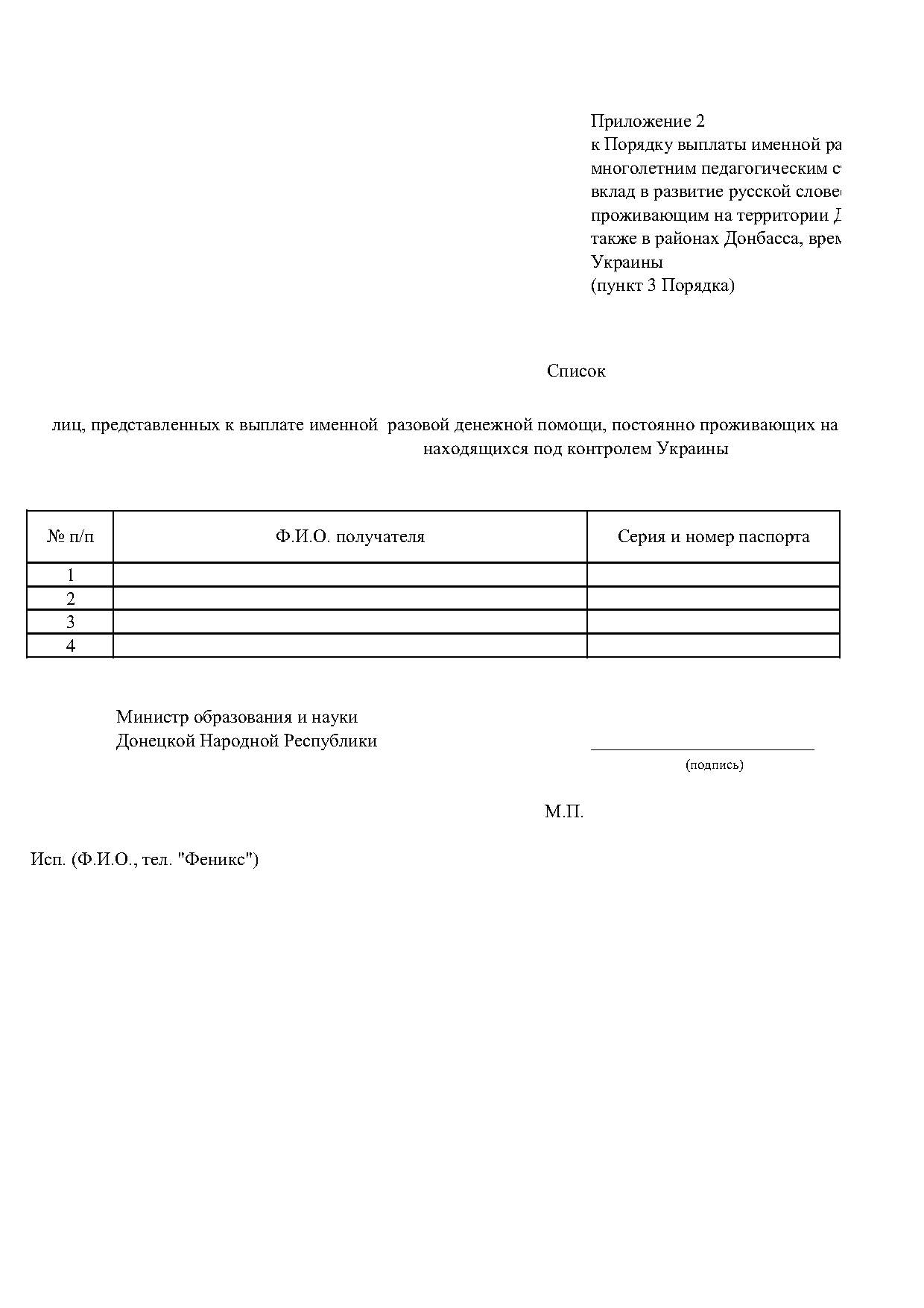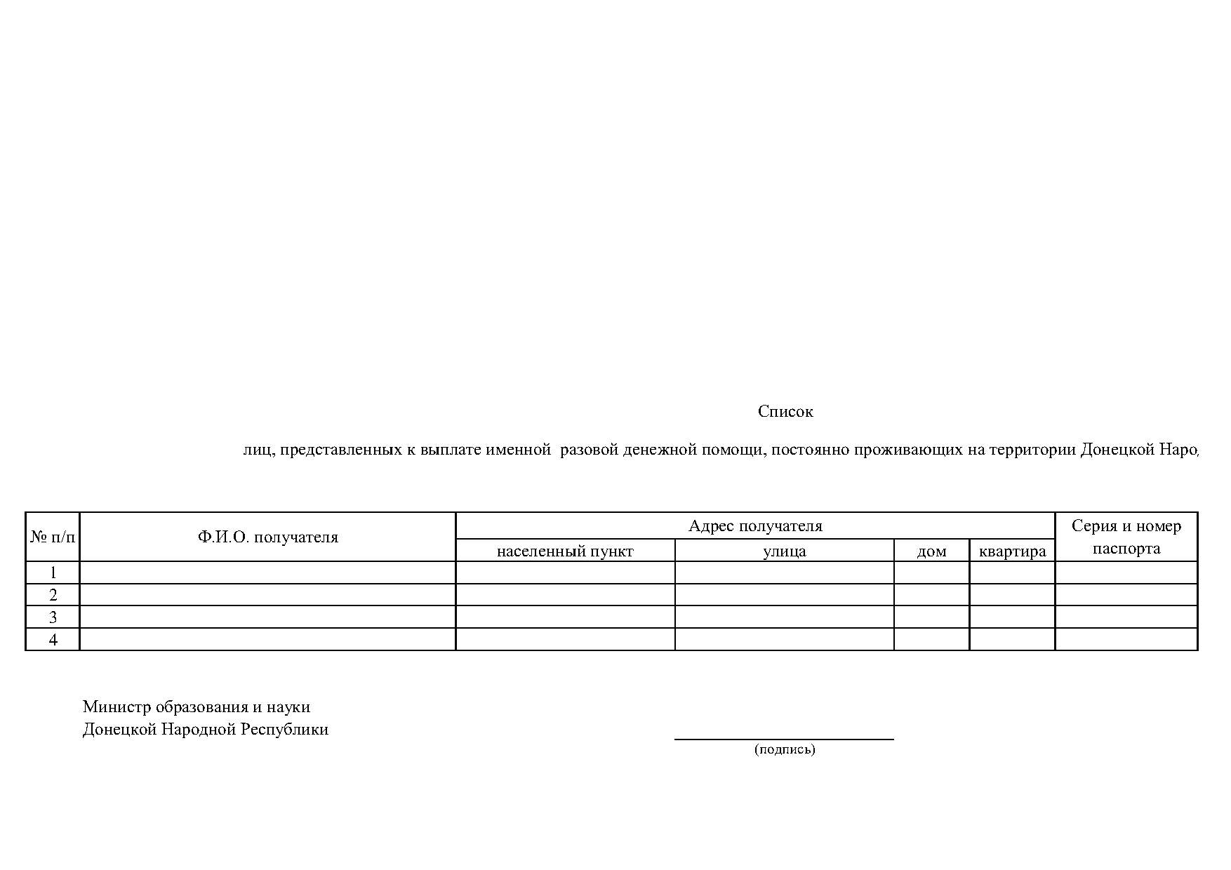 Для граждан, постоянно проживающих на территории Донецкой Народной Республики, Министерство образования вместе со списком лиц, представленных к выплате именной разовой денежной помощи, направляет в Министерство труда: