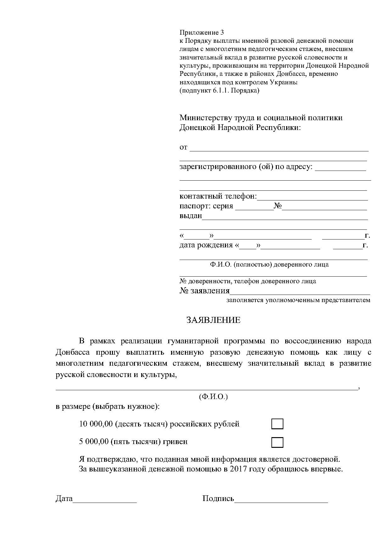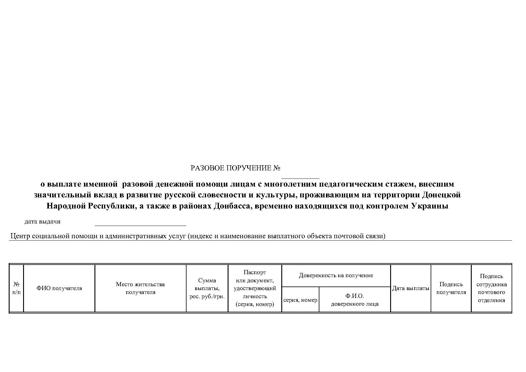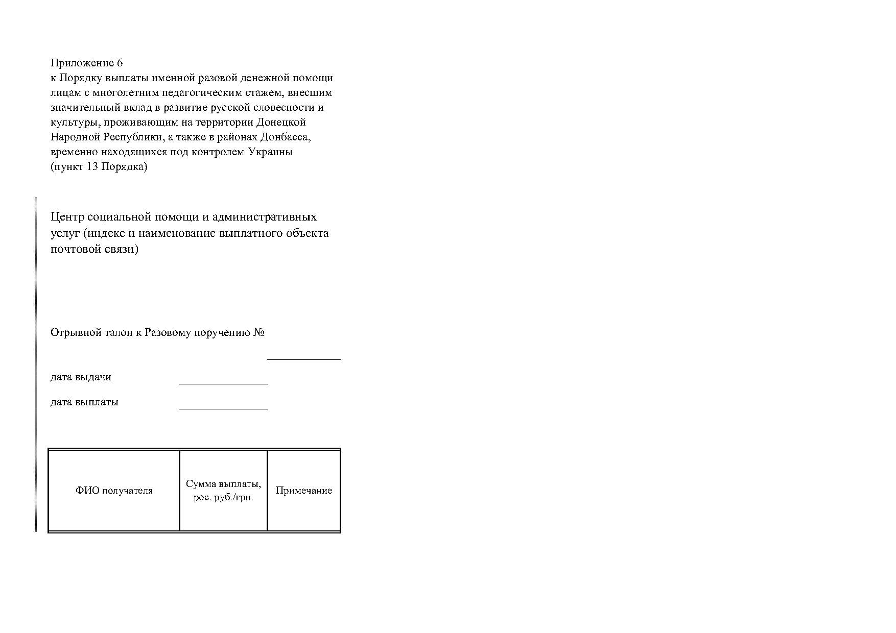 - Для граждан, проживающих в районах Донбасса, временно находящихся под контролем Украины, после приема документов уполномоченное лицо Министерства труда проводит сверку предоставленных сведений с электронным реестром выплаты именной разовой денежной помощи лицам с многолетним педагогическим стажем, внесшим значительный вклад в развитие русской словесности и культуры, (далее - Реестр) после чего формирует Протокол о выплате именной разовой денежной помощи лицам с многолетним педагогическим стажем, внесшим значительный вклад в развитие русской словесности и культуры, (далее - Протокол о выплате именной разовой денежной помощи) (Приложение 5) и Разовое поручение о выплате именной разовой денежной помощи лицам с многолетним педагогическим стажем, внесшим значительный вклад в развитие русской словесности и культуры, (далее - Разовое поручение) с отрывным талоном в первом экземпляре (Приложение 6), которое выдается заявителю или его представителю.