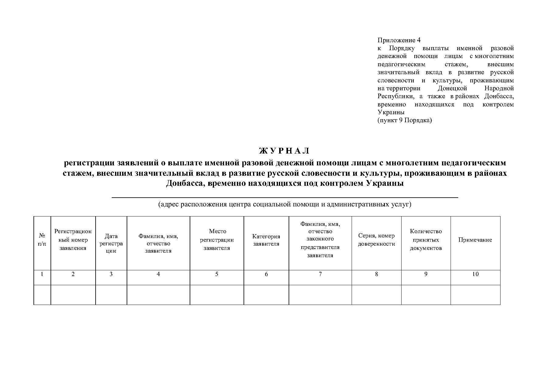 - Для граждан, проживающих в районах Донбасса, временно находящихся под контролем Украины, после проведения проверки уполномоченным лицом Министерства труда предоставленных документов, заверения копий документов заявление регистрируется в Журнале регистрации заявлений о выплате именной разовой денежной помощи лицам с многолетним педагогическим стажем, внесшим значительный вклад в развитие русской словесности и культуры (далее - Журнал) (Приложение 4).