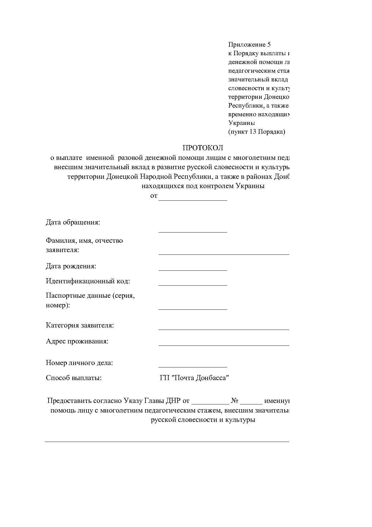 5. Утвердить Порядок выплаты именной разовой денежной помощи лицам с многолетним педагогическим стажем, внесшим значительный вклад в развитие русской словесности и культуры, проживающим на территории Донецкой Народной Республики, а также в районах Донбасса, временно находящихся под контролем Украины (Приложение).